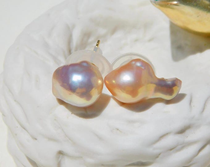 Freshwater Pearl Studs: Solid 18K Gold, 12.5mm, AAA+, Copper Red, Super Metallic Luster